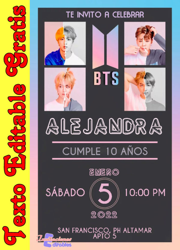 Ahorra tiempo y dinero con esta invitación editable de BTS y enfoca tu presupuesto en otros detalles como la comida, decoración, animación y juegos para tu fiesta temática de este personaje.