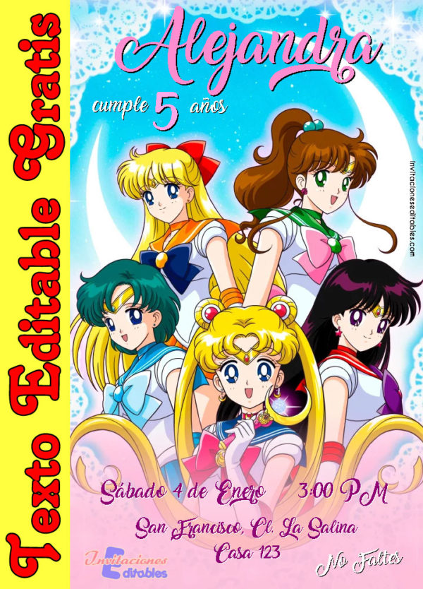 No te compliques por diseñar una invitación. Esta invitación de Sailor Moon para editar online te sacará de apuro.
